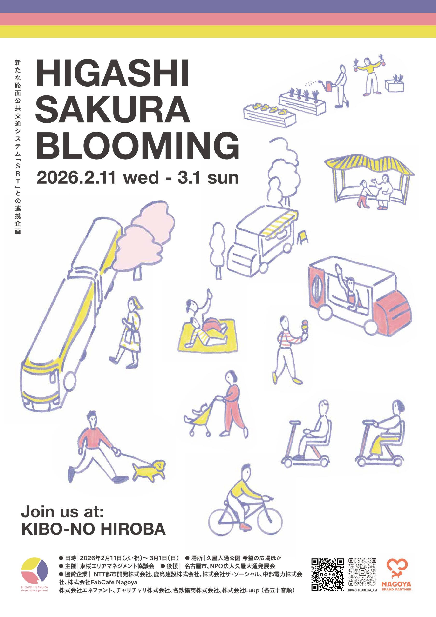 2/11(水・祝)より3月1日(日)の19日間、東桜エリアマネジメント協議会による東桜エリアの回遊促進をめざす社会実験『HIGASHI SAKURA BLOOMING ~モビリティ&パーク~』が開催されます。SRTの開業にあわせて久屋大通公園周辺を舞台に、回遊や滞在を楽しむ取組を予定しています。