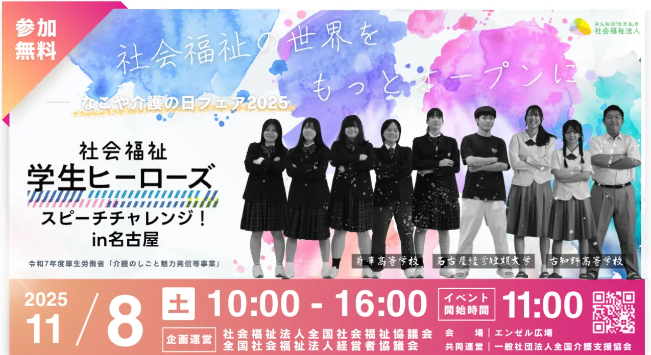 メインステージにて、一般社団法人 全国介護支援協会(共同運営)による「社会福祉学生ヒーローズスピーチチャレンジin名古屋」を開催します。