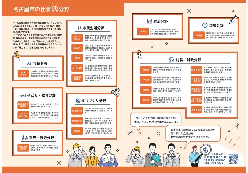 名古屋市の仕事は、福祉、子ども・教育、観光・歴史、市民生活、まちづくり、経済、環境から総務・財政に至るまで幅広く、多様な分野で市民の暮らしを支えています。