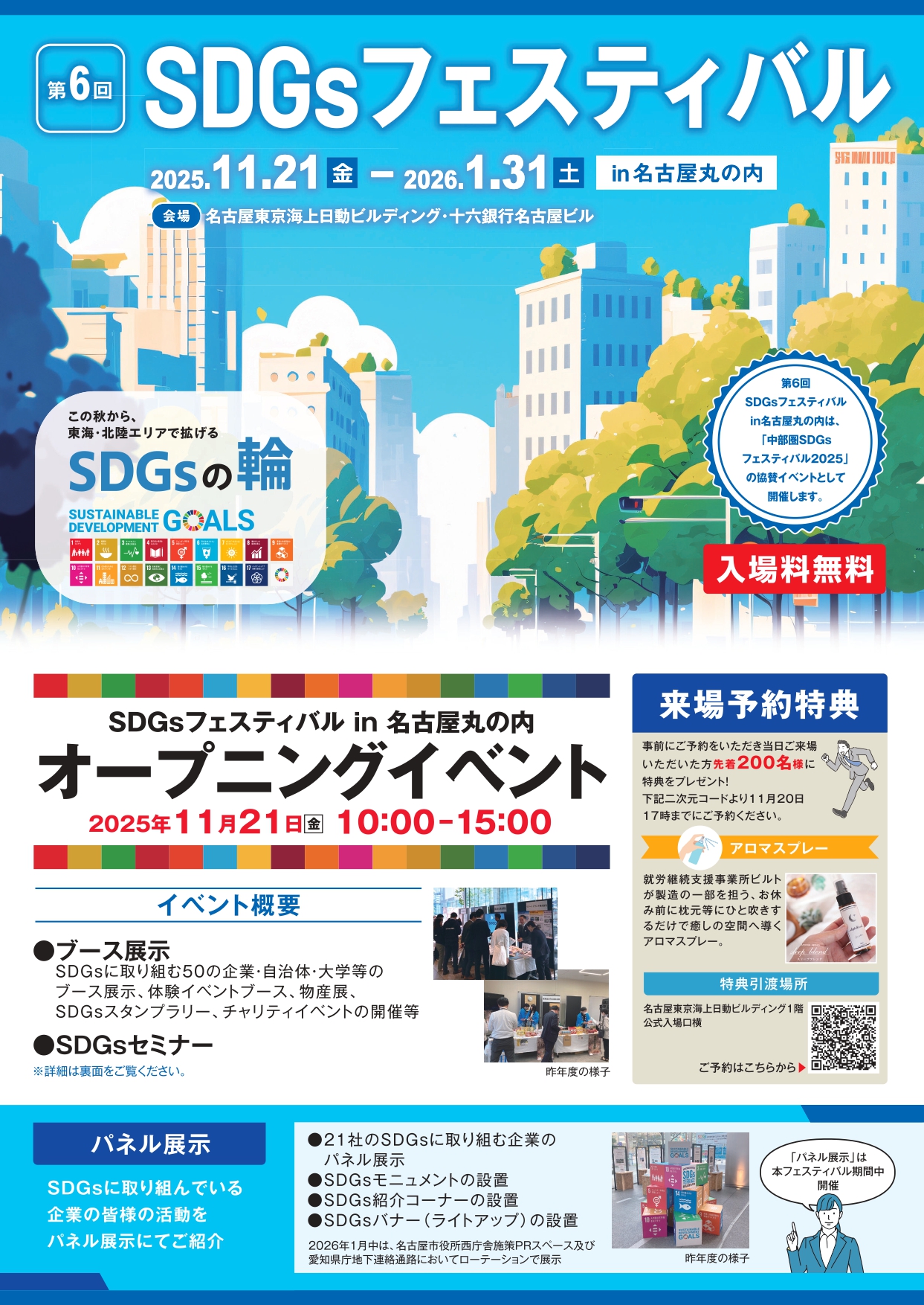 11月21日(金)から1月31日(土)まで、「第6回・SDGsフェスティバルin名古屋丸の内」が名古屋東京海上日動ビルディング・十六銀行名古屋ビルにて開催されます。