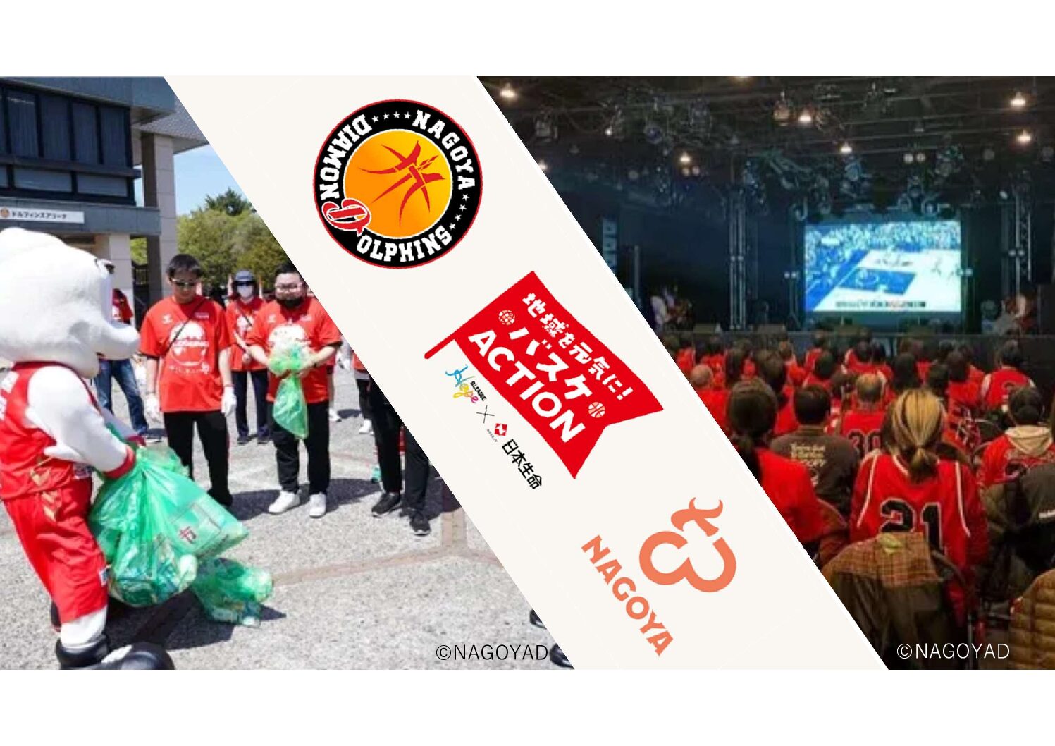 この度、そのトップスポーツチームの一つである名古屋ダイヤモンドドルフィンズと日本生命、名古屋市の共催で、街をきれいにしながら楽しく走る・歩くプロギング(ゴミ拾い×ジョギング)と、仲間と一緒に盛り上がれるバスケットボールのパブリックビューイングを実施します!