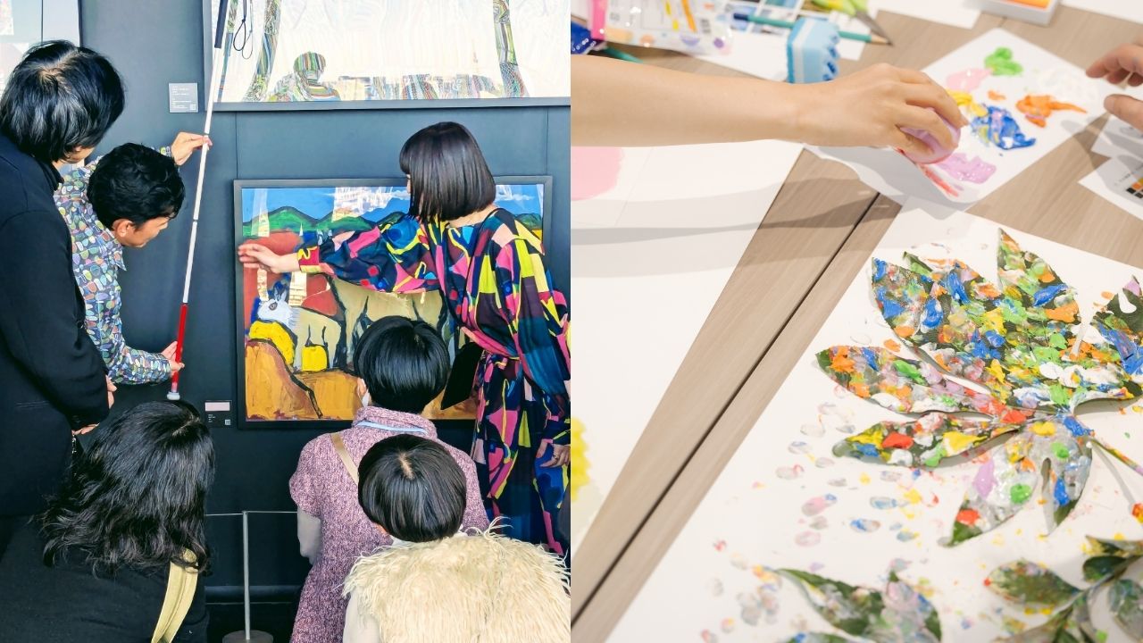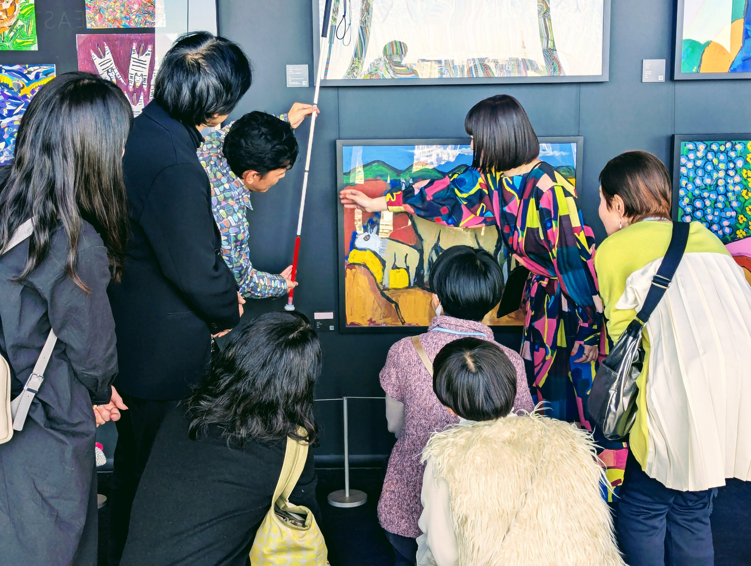 視覚障害のある「ブラインドコミュニケーター」の案内のもと、STATION Aiに展示されているヘラルボニー契約作家のアート作品を囲んで、感じたことを語り合います。 - アートワークショップ