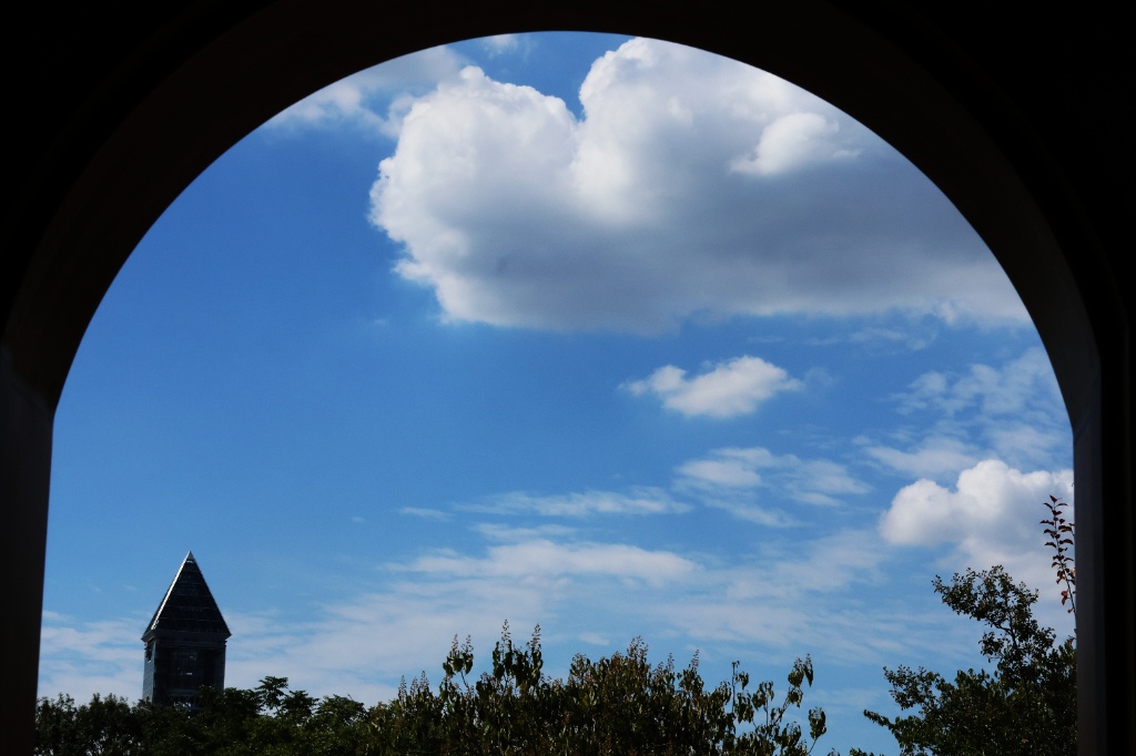 おとぎ話にでてきそうな建物がありなかから空がみえきれい。
