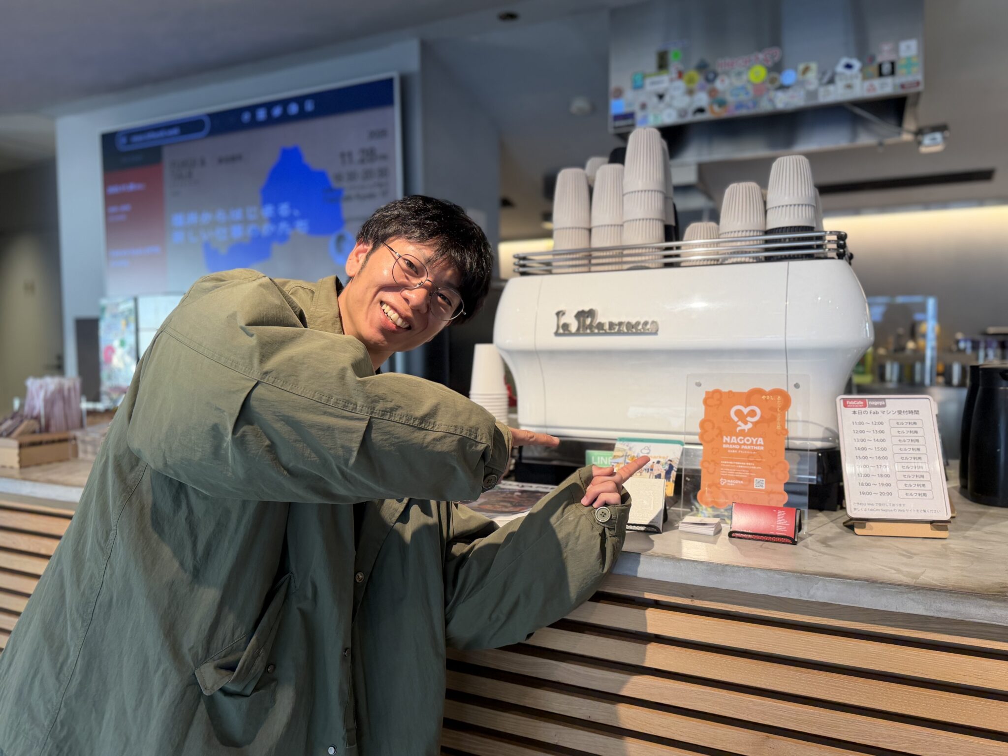 久屋⼤通公園芝⽣広場に⾯した、カフェとモノづくりスペースを融合した地域交流拠点です。⾃然⽊を活⽤した温かみある天井意匠と、広場に⼤きく開いた全⾯ガラスによる開放的な空間が特徴で、街の⼈が気軽に⽴ち寄れます。