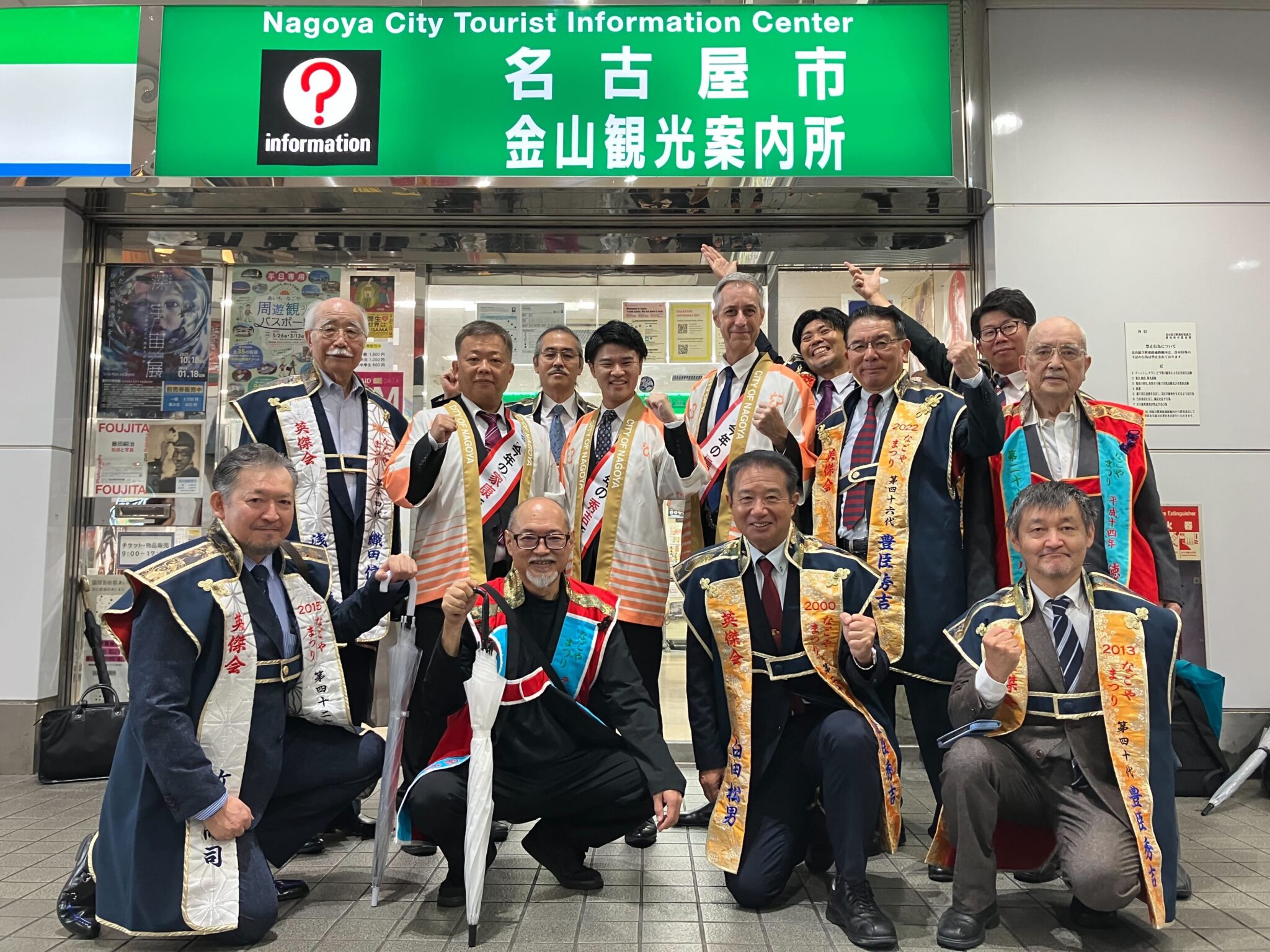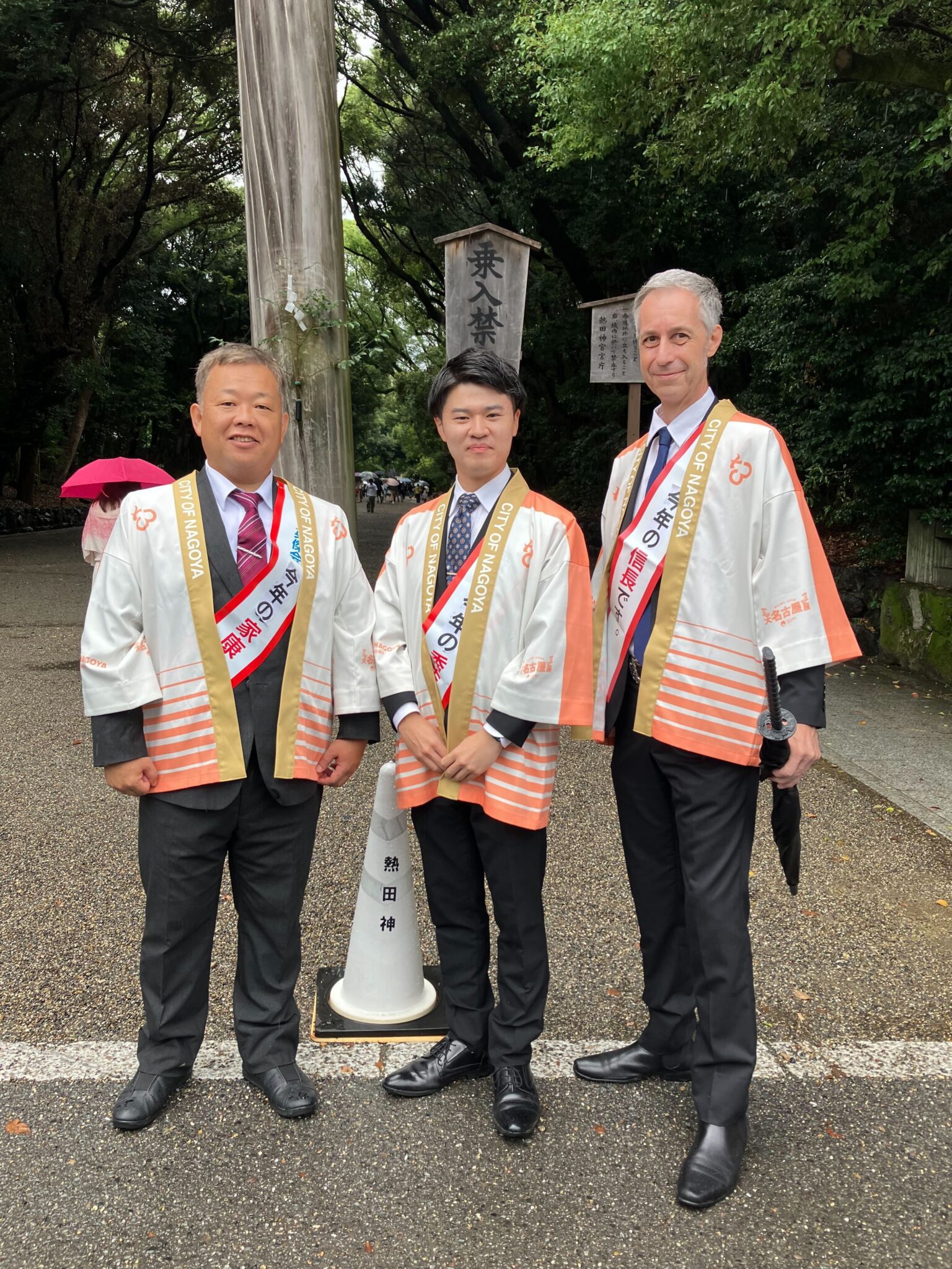 参拝後は、新三英傑が名古屋ブランドロゴの法被を着⽤し、記念撮影する場⾯も!
